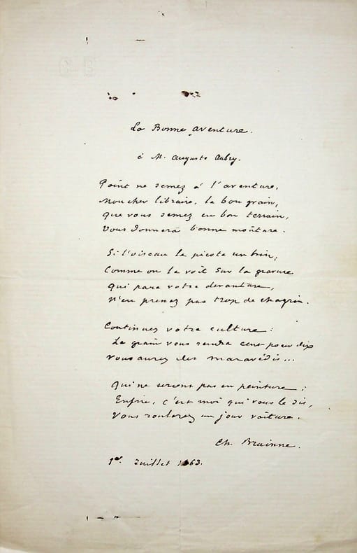 Charles Brainne (1825-1864), journaliste, écrivain. Poème autographe signé, 1er juillet 1863, 1p in-8. Joli sonnet dédicacé à Auguste Aubry (1821-1878), libraire, et titré « La Bonne aventure ». Il commence par : « Point ne semez à l'aventure, / Mon cher libraire, le bon grain, / que vous semez en bon terrain, / vous donnera bonne mouture ». Peu commun. [425]