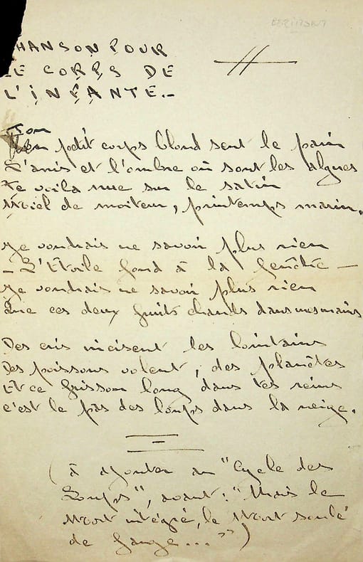 Luc Bérimont (1915-1983), poète, écrivain. Poème autographe, sd, 1p in-8. Beau poème titré « Chanson pour le corps de l'infante ». 12 vers (3 quatrains). Poème qui semble être resté inédit. Petit manque de papier angulaire mangeant deux lettres du titre. Peu commun. [425]