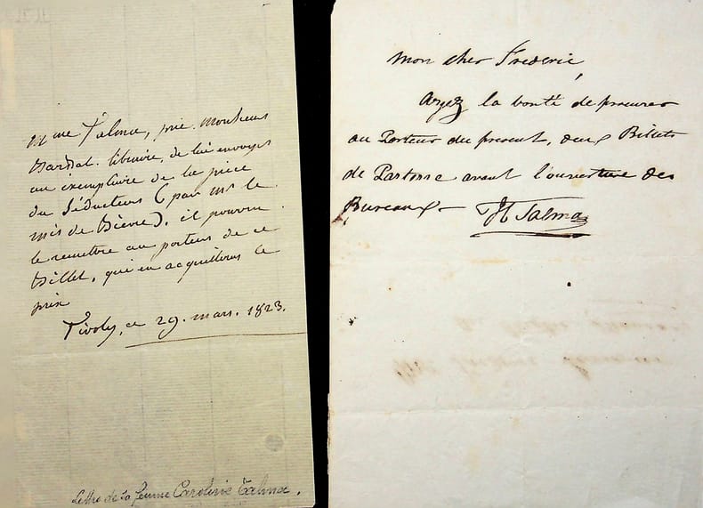 Charlotte Vanhove (1771-1860), actrice, madame Talma, sociétaire de la Comédie-Française. L.A.S. à la troisième personne, Tivoly (Rome), 29 mars 1823, 1p in-12. « Madame Talma prie monsieur Martial libraire de lui envoyer un exemplaire de la pièce du Séducteur (par Mr le Mis de Bièvre). Il pourra le remettre au porteur de ce Billet qui en acquittera le prix ». On joint un second document, d'un autre Talma, non identifié (ni Charlotte ni François-Joseph). Rare. [425]