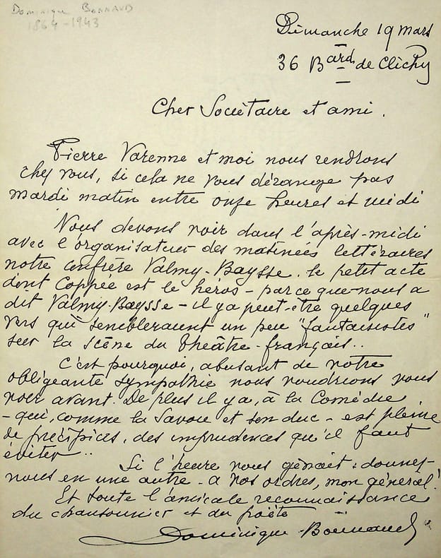 Dominique Bonnaud (1864-1943), poète, chansonnier, goguettier. L.A.S., dimanche 19 mars, 1p in-4. A un sociétaire qu'il viendra voir accompagné de Pierre Varenne le mardi suivant. La lettre mentionne Valmy-Baysse et « le petit acte donc Coppée est le héros ». [425]