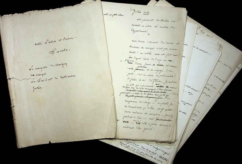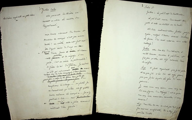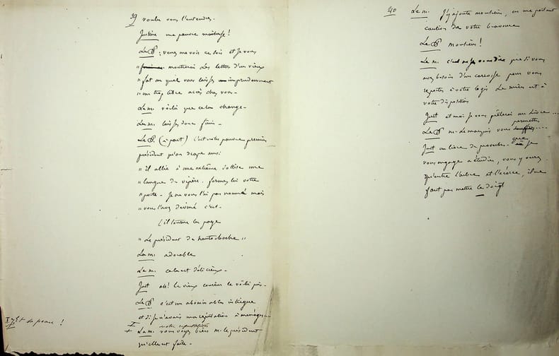 Jules Favre (1809-1880), avocat, homme politique, membre de l'Académie française. Manuscrit autographe, sd [1864], 40p in-4 (sous modeste couverture). Beau manuscrit de proverbe, Entre l'arbre et l'écorce, qui fut joué chez Jules Favre le 10 avril 1864. Il s'agit d'une belle recopie au propre avec quelques corrections, certaines de Jules Favre, d'autres d'une autre main. Le texte fut joué par Jeanne Arnould-Plessy (1819-1897), Joseph Samsan (1793-1871), Prosper Bressant (1815-1886) et « mademoiselle Nelly ». Ce proverbe a été imprimé (Paris, imp. de Brière, 1864), probablement pour un usage privé. La BnF en possède plusieurs exemplaires (notice n°FRBNF30423172). Rare document. [425]