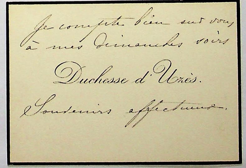 Anne de Rochechouart de Mortemart (1847-1933), duchesse d'Uzès, pilote, sculptrice, pionnière de l'automobilisme féminin. C.A., sd, 3 lignes. « Je compte bien sur vous à mes dimanches soirs. Souvenirs affectueux ». [426]
