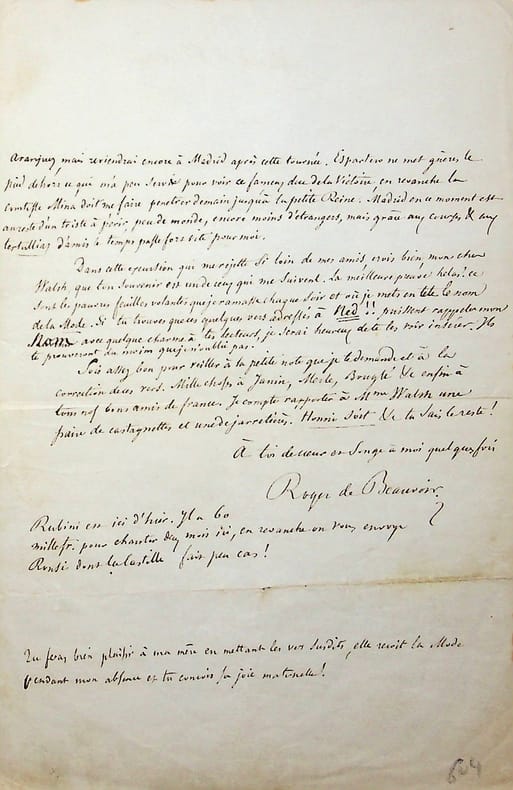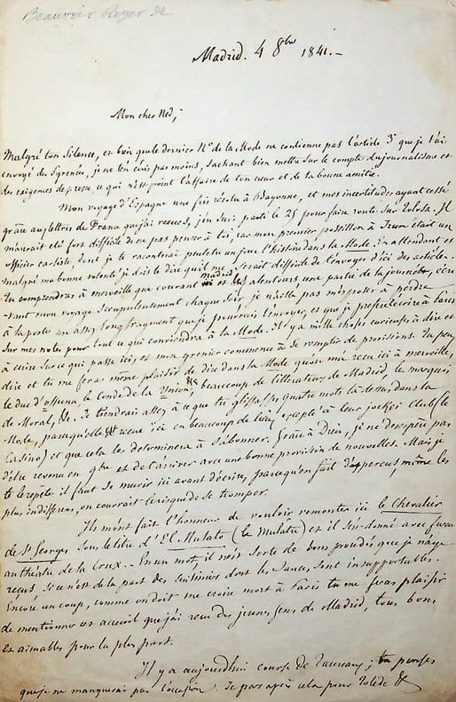 Etienne Roger dit Roger de Beauvoir (1807-1866), poète romantique, romancier, dramaturge. L.A.S., Madrid, 4 octobre 1841, 2p in-8. Longue et belle lettre à Joseph-Alexis Walsh (1782-1860), appelé « Ned » (Walsh signé N ses articles) et « mon cher Walsh » dans la lettre. Sur son voyage en Espagne, sa pièce Le Chevalier de Saint-Georges jouée à l'occasion de son passage sour le titre El Mulato, une course de taureaux où il va aller, son départ pour Tolède, l'arrivée de Giovanni Battista Rubini, payé une somme folle pour chanter, etc. Très belle lettre amicale. [426]