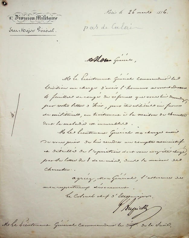 Jacques Aupick (1789-1857), général, homme politique, beau-père de Baudelaire, ministre plénipotentiaire à Constantinople. L.S., 26 mars 1836, 1p in-4. Il envoie des congés de réforme. [426]