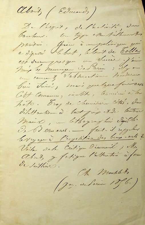 Charles Monselet (1825-1888), poète, écrivain, journaliste. Manuscrit autographe signé, 1856, 1p in-8. Belle critique, très négative, d'Edmond About et ses premiers livres, a priori publiée dans la Gazette de Paris (hebdomadaire publié d'avril 1856 à septembre 1859) : « De l'esprit, de l'activité, du bonheur. Un type [mot illisible] de parisien. Grâce à une polémique qui a dépassé le but, le bruit de Tolla est devenu presque un succès. J'aime mieux Les Mariages de Paris; il y a un courant d'observation moderne bien suivi ; mais quelque fois aussi, c'est convenu, inutile, terminé à la hâte. Trop de chemisiers cités, du dilettantisme à tout prix et de toutes mains, une lithographie d'après Charles de Bernard. Faut-il rappeler le Voyage à l'exposition des Beaux-Arts ? Voilà de la critique d'écureuil ; M. About y fatigue l'attention à force de saillies. Ch. Monselet (gaz. de Paris 1856) ». Beau document du jeune écrivain. [427]