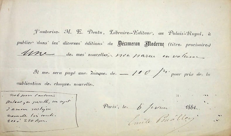 Armand Silvestre (1837-1901), poète, écrivain. P.S., Paris, 5 février 1884, 1p in-8 oblong. Belle autorisation à Dentu pour imprimer des nouvelles de Silvestre dans son Décameron moderne. [427]