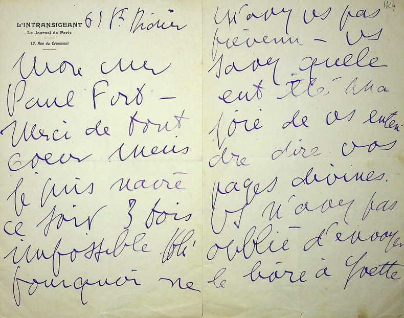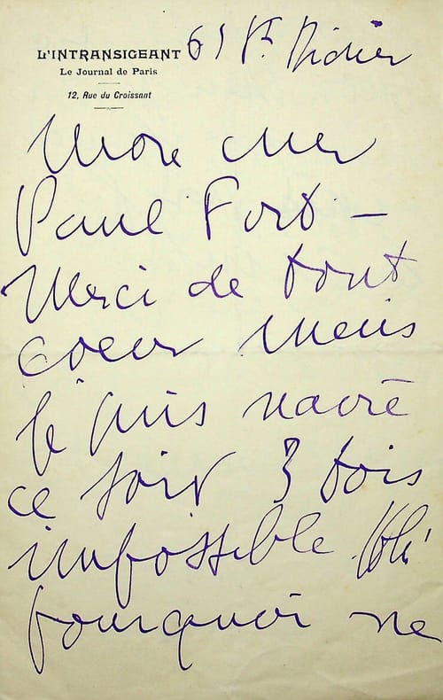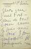 Lettre de remerciements à Paul Fort suite à l'envoi d'un exemplaire des "Ballades françaises" 2e série. Remerciements non exempts d'un certain paternalisme. * Voir photographie(s) / See the picture(s). * Membre du SLAM et de la LILA / ILAB Member. La librairie est ouverte du lundi au vendredi de 14h à 19h. Merci de nous prévenir avant de passer,certains de nos livres étant entreposés dans une réserve.