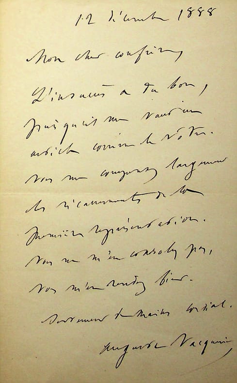 Auguste Vacquerie (1819-1895), poète, écrivain, photographe. L.A.S., 12 décembre 1888, 1p in-8. « Mon cher confrère, L'insuccès a du bon, puisqu'il me vaut un article comme le vôtre. Vous me compensez largement les ricanements de la première représentation. Vous ne m'en consolez pas, vous m'en rendez ffier. Serrement de mains cordial. Auguste Vacquerie ». Vacquerie avait en effet fait jouer En puissance de mari au théâtre du Gymnase. Cette pièce fut créée le 4 décembre 1888. [427]