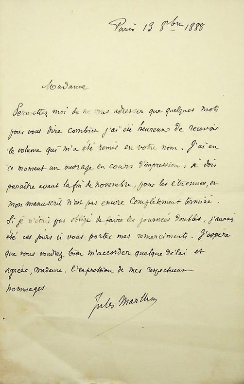 Jules Martha (1853-1932), archéologue, membre de l'Ecole française de Rome. L.A.S., Paris, 13 octobre 1888, 1p in-8. « Madame, Permettez-moi de ne vous adresser que quelques mots pour vous dire combien j'ai été heureuse de recevoir le volume qui m'a été remis en votre nom. J'ai en ce moment un ouvrage en cours d'impression : je dois paraître avant la fin de novembre, pour les étrennes, et mon manuscrit n'est pas encore complètement terminé. Si je n'étais obligé de faire les journées doubles, j'aurais été ces jours-ci vous porter mes remerciements. J'espère que vous voudrez bien m'accorder quelque délai et agréez, Madame, l'expression de mes respectueux hommages. Jules Martha ». Peu commun [427]