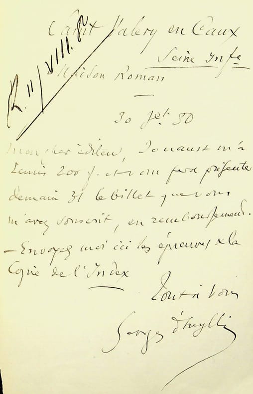 Georges d'Heylli (1833-1902), écrivain, journaliste. L.A.S., 30 juillet 1880, 1p in-12. Il signale à son éditeur (peut-être Paul Ollendorff) avoir reçu 200 francs de l'éditeur Jouaust qui lui présentera un billet le lendemain. [427]