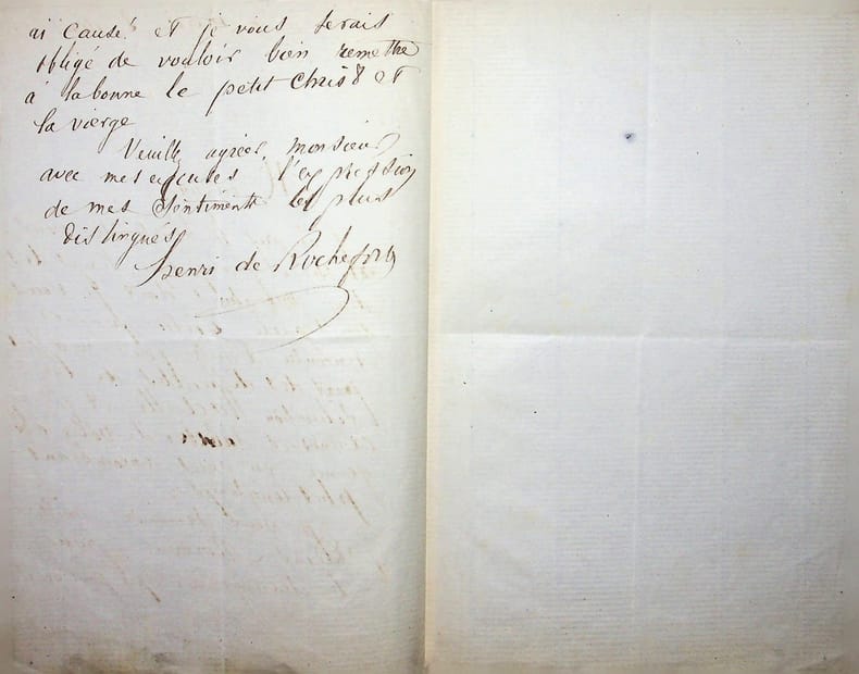 Henri Rochefort (1831-1913), écrivain, pamphlétaire, journaliste. L.A.S. « Henri de Rochefort », mardi 8 avril, 1p 1/2 in-8. « Monsieur, J'ai pris la liberté de vous adresser il y a quelque temps les deux miniatures dont je vous avais parlé. Piétri que j'ai rencontré l'autre jour m'a fait part des difficultés de la situation actuelle et je craindrais d'abuser de votre obligeance en vous encombrant plus longtemps. Je vous demande mille pardons monsieur pour le dérangement que je vous ai causé et je vous serais obligé de vouloir bien remettre à la bonne le petit Christ et la Vierge. Veuillez agréer, Monsieur, avec mes excuses, l'expression de mes sentiments les plus distingués. Henri de Rochefort ». [427]