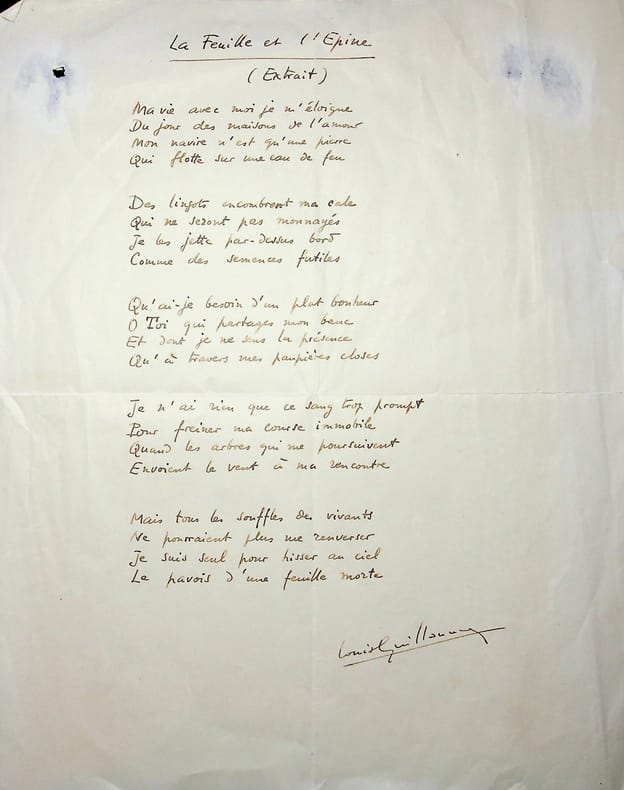 Louis Guillaume (1907-1971), poète, écrivain, membre de l'Ecole de Rochefort. Poème autographe signé, sd [1956], 1p in-4. Beau poème entièrement autographe, formé de 5 quatrains (20 vers) et titré La Feuille et l'Epine. Il est probablement tiré de son recueil de poèmes éponyme publié en 1956. Traces de collage au dos. Belle copie. [428]