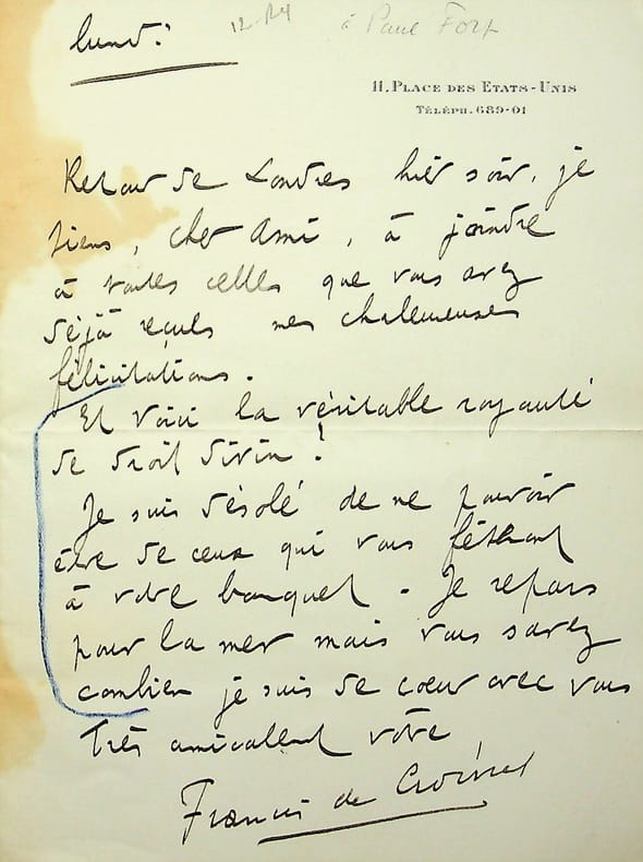Francis de Croisset (1877-1937), écrivain. L.A.S., sd [lundi, 1912], 1p in-8. Au poète Paul Fort (1872-1960). Il ne pourra pas être présent au banquet pour Paul Fort, probablement suite à son élection comme prince des poètes vu cette petite phrase : « Et voici la véritable royauté de droit divin ! ». [428]