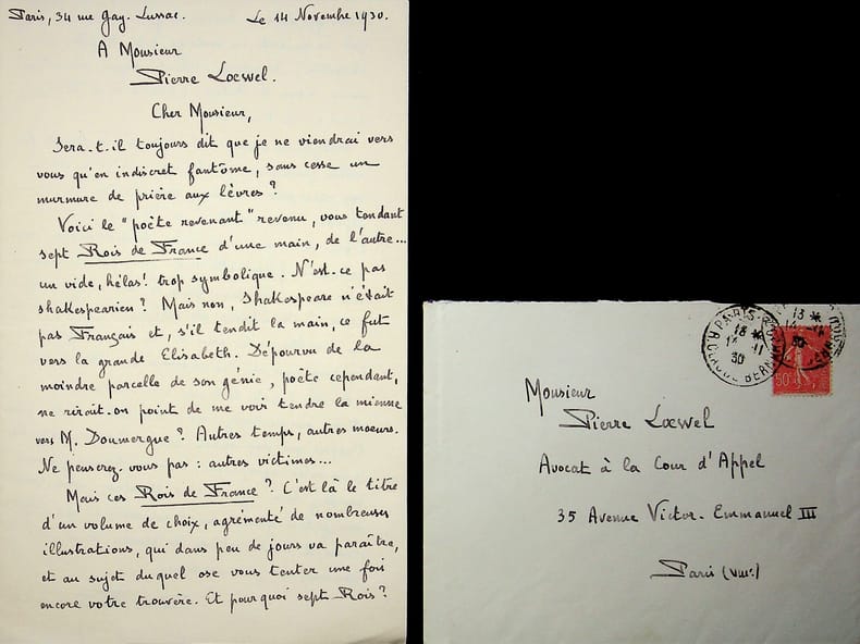 Paul Fort (1872-1960), poète. L.A.S. + enveloppe, 11 novembre 1930, 2p in-8. A l'écrivain Pierre Loewel (1890-1955). Belle lettre pour lui vendre un exemplaire de son Rois de France à paraître. [428]
