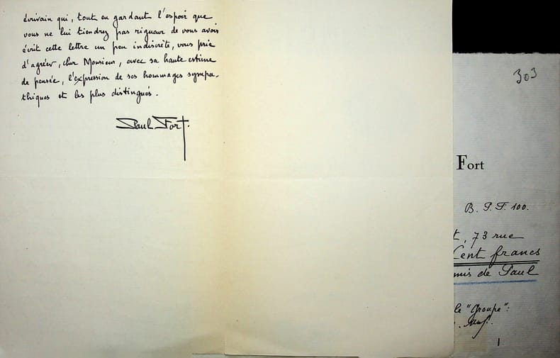 Paul Fort (1872-1960), poète. L.A.S., 16 février 1930, 1p 1/2 in-8. A l'écrivain Pierre Loewel (1890-1955). Belle lettre pour lui vendre un exemplaire de son Amour enfant de Bohème à paraître. On joint un reçu pour une cotisation au groupe des amis de Paul Fort au nom de Jean Botrot. [428]