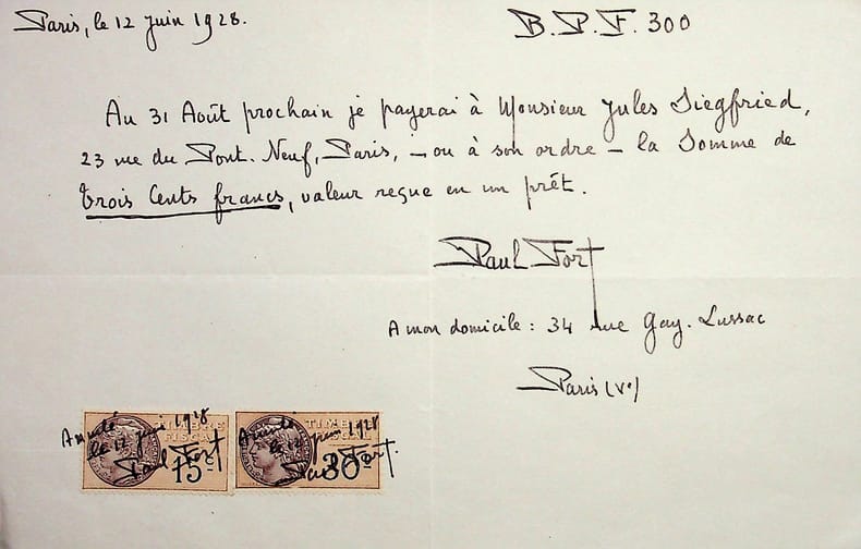 Paul Fort (1872-1960), poète. P.A.S., 12 juin 1928, 1p in-8 oblong. A Jules Siegfried, un homonyme de l'homme politique. Reconnaissance de dette. [428]