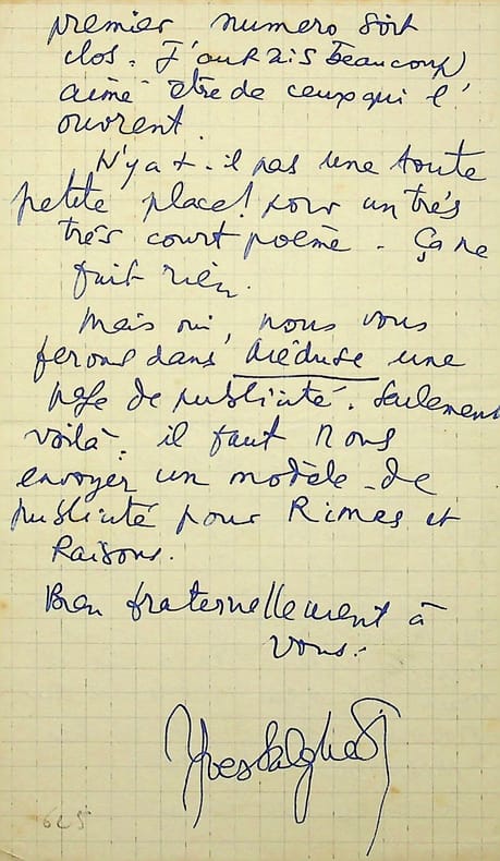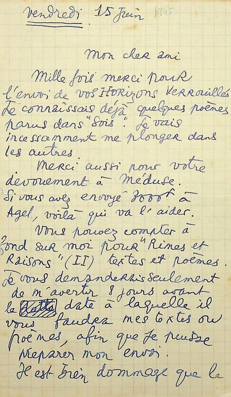 Yves Salgues (1922-1997), poète, écrivain, journaliste, membre de l'Ecole de Rochefort. L.A.S., vendredi 15 juin 1945, 2p in-8. Au poète et éditeur Gaston Puel (1924-2013), autre membre de l'école de Rochefort. « Mon cher ami, Mille fois merci pour l'envoi de vos Horizons verrouillés. Je connaissais déjà quelques poèmes parus dans Soir. Je vais incessamment me plonger dans les autres. Merci aussi pour votre dévouement à Méduse. Si vous avez envoyé 3000F à [Henri] Agel, voilà qui va l'aider. Vous pouvez compter à fond sur moi pour "Rimes et Raisons" (II) textes et poèmes. Je vous demanderais seulement de m'avertir 8 jours avant la date à laquelle il vous faudra mes textes ou poèmes, afin que je puisse préparer mon envoi. Il est bien dommage que le premier numéro soit clos. J'aurais beaucoup aimé être de ceux qui l'ouvrent. N'y a-t-il pas une toute petite place ! Pour un très court poème. Ça ne fait rien. Mais oui, nous nous ferons dans Aréduse une page de publicité. Seulement voilà : il faut nous envoyer un modèle de publicité pour Rimes et Raisons. Bien fraternellement à vous. Yves Salgues ». Méduse est la nouvelle revue dans laquelle Salgues est impliqué. Belle lettre entre les deux jeunes poètes. [429]