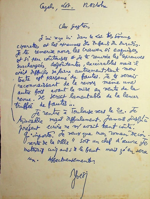 Yves Salgues (1922-1997), poète, écrivain, journaliste, membre de l'Ecole de Rochefort. L.A.S., 12 octobre [1945], 1p in-8. Au poète et éditeur Gaston Puel (1924-2013), autre membre de l'école de Rochefort. « Cher Gaston, J'ai reçu ici dans le Lot tes bonnes cigarettes et les épreuves des Enfants du Paradis. Je te remercie pour les Craven si exquises et si peu coûteuses et je te renvoie les épreuves surchargées, dégoûtantes, exécrables mais il était difficile de faire autrement tant mon texte est parsemé de fautes. Je te serais reconnaissant de le revoir même une autre fois avant la mise en vente de la revue. Il serait lamentable de la lancée truffée de fautes. Je rentre à Toulouse vers le 20. Je travaille mais difficilement. Jamais jusqu'à présent écrire ne m'avait tant coûté. Qu'importe ! Je veux que mon roman "Découverte de la ville" soit un chef d'oeuvre. Je mettrais cinq ans s'il le faut mais c'en sera un. Affectueusement. Yves S. ». Les Enfants du Paradis est un film sorti en 1945. Salgues tenais la chronique cinéma dans Rimes et Raisons, la revue de Puel. Belle lettre entre les deux jeunes poètes. [429]