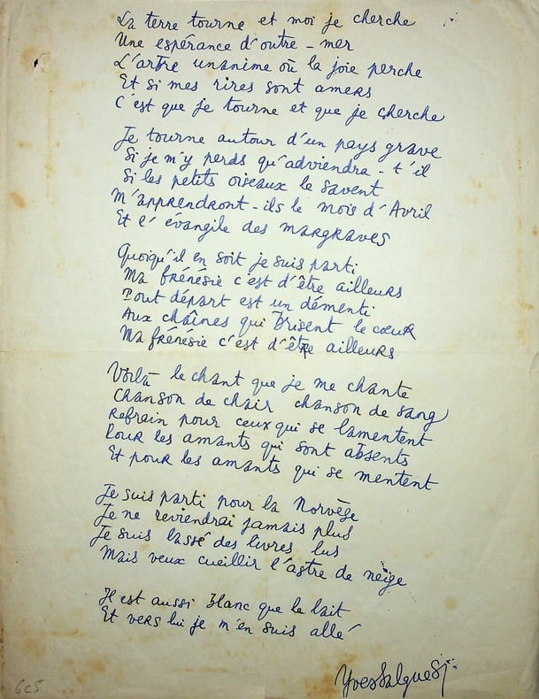 Yves Salgues (1922-1997), poète, écrivain, journaliste, membre de l'Ecole de Rochefort. Poème autographe signé, sd [1945], 2p in-4. Long poème de 51 vers titré « Chanson pour ne plus revenir » et dédié à Georges Galy-Gasparrou (1896-1979). Ce poème a vraisemblablement été édité dans Rimes et Raisons, la revue que Gaston Puel crée en 1945. Très beau document, issu des archives du poète et éditeur Gaston Puel (1924-2013), autre membre de l'école de Rochefort. [429]