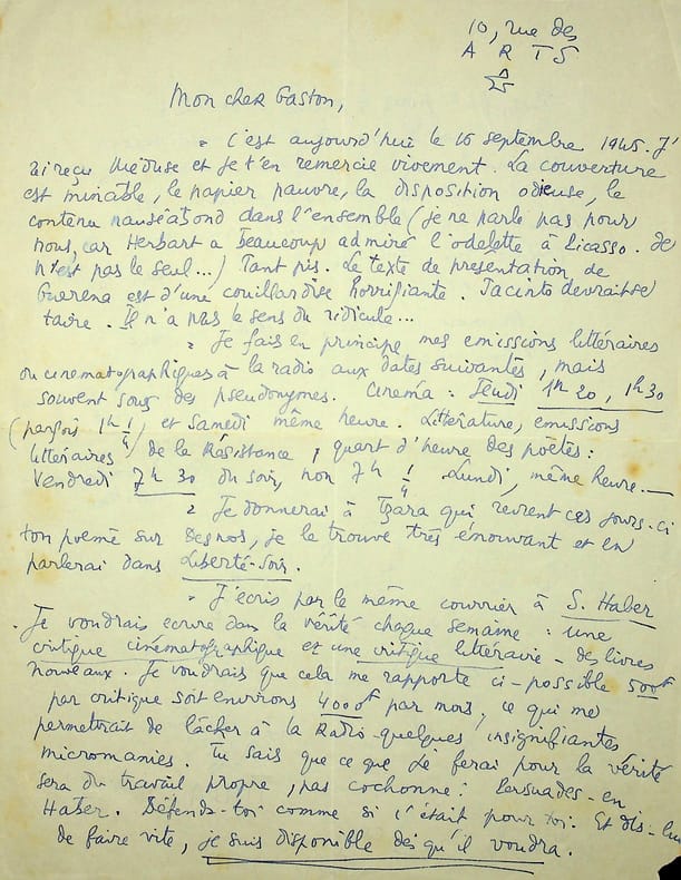 Yves Salgues (1922-1997), poète, écrivain, journaliste, membre de l'Ecole de Rochefort. L.A.S., 16 septembre 1945, 2p in-4. Au poète et éditeur Gaston Puel (1924-2013), autre membre de l'école de Rochefort. Il commence par une magnifique critique de la revue Méduse de Jacinto-Luis Guerena à laquelle Puel et Salgues ont participé : « C'est aujourd'hui le 16 septembre 1945. J'ai reçu Méduse et je t'en remercie vivement. La couverture est minable, le papier pauvre, la disposition odieuse, le contenu nauséabond dans l'ensemble (je ne parle pas pour nous, car Herbart a beaucoup admiré l'odelette à Picasso. Il n'est pas le seul.). Tant pis. Le texte de présentation de Guerena est d'une couillardise horrifiante. Jacinto devrait se taire. Il n'a plus le sens du ridicule. ». La suite concerne ses émissions littéraires et cinématographiques à la radio, la visite prochaine de Tristan Tzara à qui il donnera le poème de Puel sur Desnos, les critiques qu'il souhaite publier. Il termine en écrivant de manière désordonnée, à la manière des surréalistes : « EN regrettant beaucoup de n'avoir PAS MANGÉ UNE GLACE AVEC TOUA LUNDI DERNIER ». Belle lettre entre les deux jeunes poètes. [429]