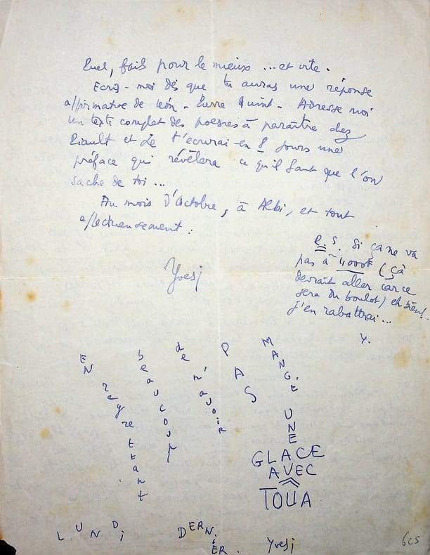 Yves Salgues (1922-1997), poète, écrivain, journaliste, membre de l'Ecole de Rochefort. L.A.S., 8 juillet [1945], 2p in-4. Au poète et éditeur Gaston Puel (1924-2013), autre membre de l'école de Rochefort. Belle lettre amicale mentionnant notamment ses participations à la revue Rimes et Raisons de Gaston Puel, ses discussions avec Tristan Tzara mentionnant Puel, la lecture des lettres et poèmes de Puel qui le ravit, etc. Papier fragile, petites déchirures. Belle lettre entre les deux jeunes poètes. [429]
