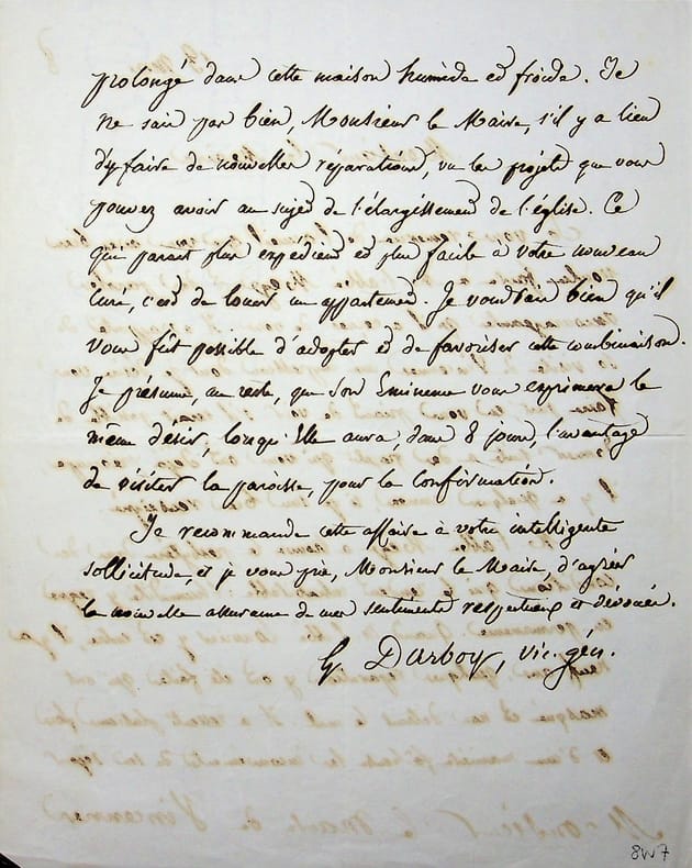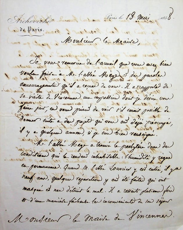 Georges Darboy (1813-1871), évêque de Nancy puis archevêque de Paris, fusillé par la Commune le 24 mai 1871. L.A.S., 13 mai 1858, 2p in-8. A Jean-Joseph Aubert (1793-1870), maire de Vincennes. Il est alors vicaire général de l'archevêque de Paris, le cardinal Morlot, à qui il succèdera. Belle lettre remerciant pour l'accueil fait au nouveau curé de Vincennes, l'abbé Mège, et lui indiquant que le presbytère a besoin de travaux. Belle lettre. [429]