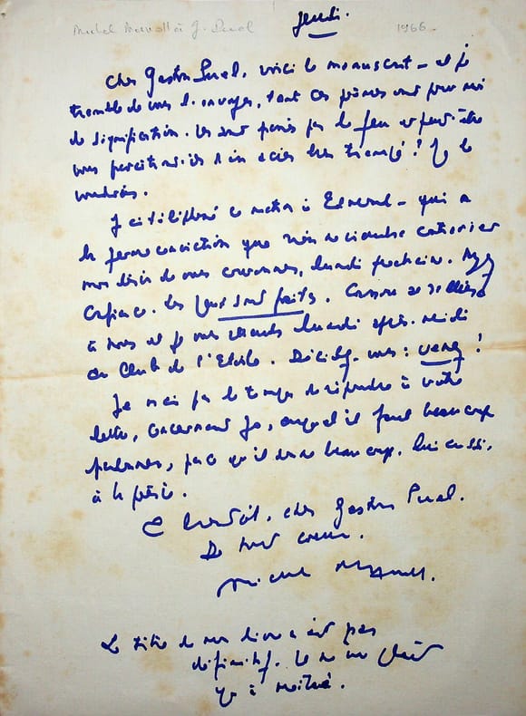 Michel Manoll (1911-1984), poète, écrivain, membre de l'Académie de Rochefort. L.A.S., sd [jeudi, probablement le 10 mars 1966], 1p in-4. Au poète et éditeur Gaston Puel (1924-2013), autre membre de l'école de Rochefort. « Cher Gaston Puel, voici le manuscrit - et je tremble de vous l'envoyer, tant ces poèmes ont pour moi de signification. Ils sont passés par le feu et peut-être vous paraîtront-ils d'un acier bien trempé ! Je le voudrais. J'ai téléphoné ce matin à Edouard[?] qui a la ferme conviction que rien ne viendra contrarier mon désir de vous couronner, lundi prochain. Ayez confiance. Les jeux sont faits. Comme on s'attend à vous[?] et je vous attends lundi après-midi au club de l'Etoile. Décidez-vous : venez ! Je n'ai pas le temps de répondre à votre lettre, concernant Jo, auquel il faut beaucoup pardonner, parce qu'il donne beaucoup, lui aussi, à la poésie. A bientôt, cher Gaston Puel. De tout coeur. Michel Manoll. Le titre de mon livre n'est pas définitif. Il ne me plait qu'à moitié ». Jo est le surnom du poète Georges Herment (1912-1969). Très intéressante lettre quelques jours avant que lui soit décerné le prix Max-Jacob (le lundi 14 mars 1966) au club de l'Etoile. Jolie lettre, signature peu commune. [429]