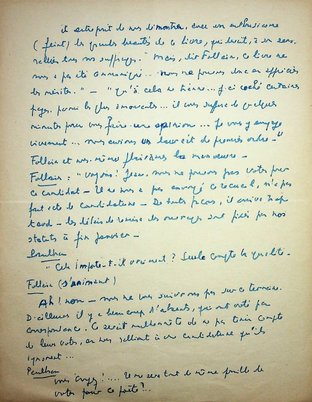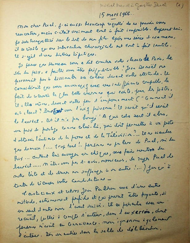 Michel Manoll (1911-1984), poète, écrivain, membre de l'Académie de Rochefort. L.A.S., 15 mars 1966, 3p 1/2 in-4. Au poète et éditeur Gaston Puel (1924-2013), autre membre de l'école de Rochefort. Superbe lettre racontant la réunion pour le prix Max-Jacob, décerné à Gaston Puel, la veille. Il y décrit la colère de Jean Denoël, furieux que Puel n'ait pas fait le déplacement et déclarant même qu'il fallait rayer Puel de la liste des candidats. « L'astucieux et retors Jean Paulhan use d'une autre méthode, extrêmement perfide et qui pouvait être payante si un seul d'entre nous l'avait suivi ». Il a présenté un obscur ouvrage publié à compte d'auteur dans l'Auxerrois, avec beaucoup d'entrain. Manoll rapporte alors la discussion avec Jean Follain, les manoeuvres de Jean Paulhan qui faisait partie du « clan N.R.F. » comme le dit Manoll dans une lettre du 23 février 1966. Il termine en parlant de son émission sur France-Culture, dont il ne sait pas l'avenir (France-Culture a alors des difficultés), et de son projet d'Histoire Universelle de la Poésie chez Flammarion. Très longue et belle lettre, signature peu commune. [429]