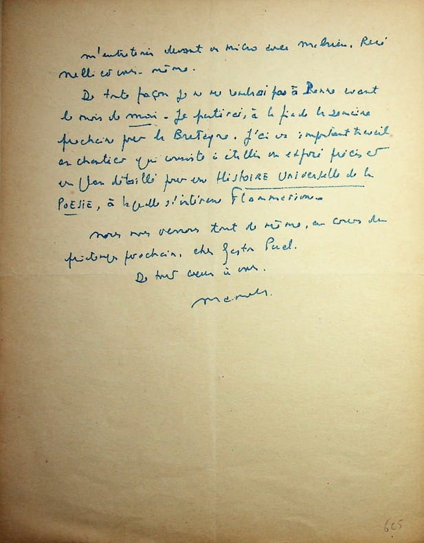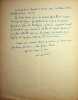 Michel Manoll (1911-1984), poète, écrivain, membre de l'Académie de Rochefort. L.A.S., sd [jeudi, probablement le 10 mars 1966], 1p in-4. Au poète et éditeur Gaston Puel (1924-2013), autre membre de l'école de Rochefort. « Cher Gaston Puel, voici le manuscrit - et je tremble de vous l'envoyer, tant ces poèmes ont pour moi de signification. Ils sont passés par le feu et peut-être vous paraîtront-ils d'un acier bien trempé ! Je le voudrais. J'ai téléphoné ce matin à Edouard[?] qui a la ferme conviction que rien ne viendra contrarier mon désir de vous couronner, lundi prochain. Ayez confiance. Les jeux sont faits. Comme on s'attend à vous[?] et je vous attends lundi après-midi au club de l'Etoile. Décidez-vous : venez ! Je n'ai pas le temps de répondre à votre lettre, concernant Jo, auquel il faut beaucoup pardonner, parce qu'il donne beaucoup, lui aussi, à la poésie. A bientôt, cher Gaston Puel. De tout coeur. Michel Manoll. Le titre de mon livre n'est pas définitif. Il ne me plait qu'à moitié ». Jo est le surnom du poète Georges Herment (1912-1969). Très intéressante lettre quelques jours avant que lui soit décerné le prix Max-Jacob (le lundi 14 mars 1966) au club de l'Etoile. Jolie lettre, signature peu commune. [429]