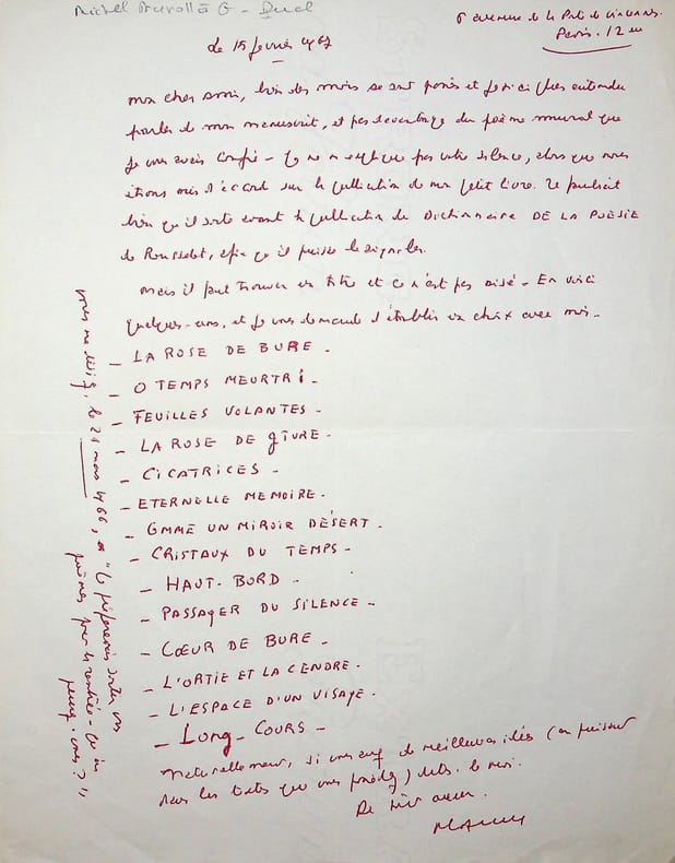 Michel Manoll (1911-1984), poète, écrivain, membre de l'Académie de Rochefort. L.A.S., 15 février 1967, 1p in-4. Au poète et éditeur Gaston Puel (1924-2013), autre membre de l'école de Rochefort. « Mon cher ami, bien des mois se sont passés et je n'ai plus entendu parler de mon manuscrit, et pas davantage du poème mural que je vous avais confié. Je ne m'explique pas votre silence, alors que nous nous étions mis d'accord sur la publication de mon petit livre. Il faudrait bien qu'il sorte avant la publication du Dictionnaire de la Poésie de Rousselot, afin qu'il puisse le signaler. Mais il faut trouver un titre et ce n'est pas aisé. En voici quelques-uns, et je vous demande d'établir un choix avec moi : [liste de 14 titres, probablement de poèmes]. Naturellement, si vous avez de meilleures idées (en puisant dans les textes que vous possédez), dites-le moi. De tout coeur. Manoll » Et il ajoute, à la verticale : « vous me disiez, le 21 mars 1966, "je préfèrerais sortir vos poèmes pour la rentrée. Qu'en pensez-vous" ». Ce recueil n'a jamais été publié. Certains poèmes cités dans la lettre semblent avoir été publiés dans Le Voyageur de l'aurore en 1986, avec justement un portrait par Roger Toulouse (les lettres de Manoll à Puel en 1966 montrent que le projet avec une illustration de Toulouse). Belle lettre. [179]