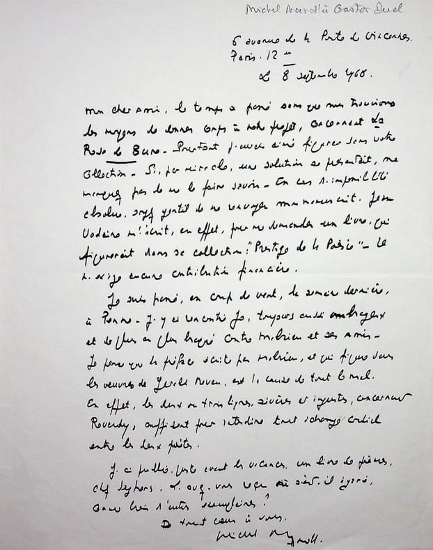 Michel Manoll (1911-1984), poète, écrivain, membre de l'Académie de Rochefort. L.A.S., sd [jeudi, probablement le 10 mars 1966], 1p in-4. Au poète et éditeur Gaston Puel (1924-2013), autre membre de l'école de Rochefort. « Cher Gaston Puel, voici le manuscrit - et je tremble de vous l'envoyer, tant ces poèmes ont pour moi de signification. Ils sont passés par le feu et peut-être vous paraîtront-ils d'un acier bien trempé ! Je le voudrais. J'ai téléphoné ce matin à Edouard[?] qui a la ferme conviction que rien ne viendra contrarier mon désir de vous couronner, lundi prochain. Ayez confiance. Les jeux sont faits. Comme on s'attend à vous[?] et je vous attends lundi après-midi au club de l'Etoile. Décidez-vous : venez ! Je n'ai pas le temps de répondre à votre lettre, concernant Jo, auquel il faut beaucoup pardonner, parce qu'il donne beaucoup, lui aussi, à la poésie. A bientôt, cher Gaston Puel. De tout coeur. Michel Manoll. Le titre de mon livre n'est pas définitif. Il ne me plait qu'à moitié ». Jo est le surnom du poète Georges Herment (1912-1969). Très intéressante lettre quelques jours avant que lui soit décerné le prix Max-Jacob (le lundi 14 mars 1966) au club de l'Etoile. Jolie lettre, signature peu commune. [429]