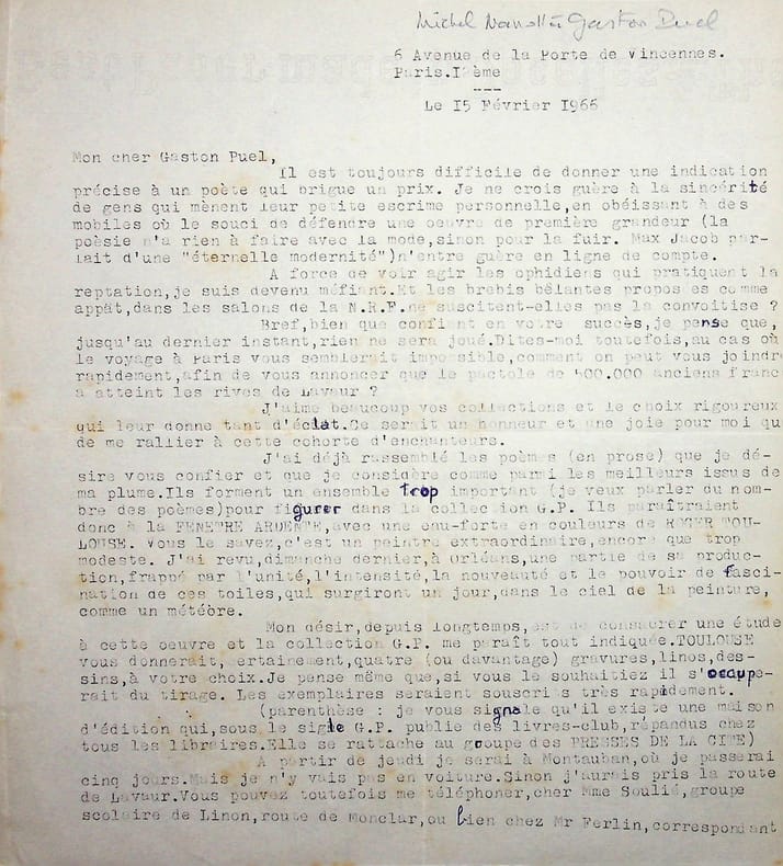 Michel Manoll (1911-1984), poète, écrivain, membre de l'Académie de Rochefort. L.S. (tapuscrite) avec corrections, 15 février 1966, 1p 1/4 in-4. Au poète et éditeur Gaston Puel (1924-2013), autre membre de l'école de Rochefort. Il est question du prix Max-Jacob, que brigue alors Puel, et qu'il obtiendra, doté de 500.000 anciens francs. Manoll est confiant en son succès. Manoll apprécie aussi beaucoup la collection éditée par Puel et a le projet de publier un livre sur l'oeuvre de Roger Toulouse. Intéressant courrier. [179]