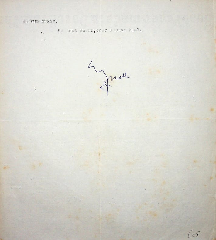 Michel Manoll (1911-1984), poète, écrivain, membre de l'Académie de Rochefort. L.A.S., sd [jeudi, probablement le 10 mars 1966], 1p in-4. Au poète et éditeur Gaston Puel (1924-2013), autre membre de l'école de Rochefort. « Cher Gaston Puel, voici le manuscrit - et je tremble de vous l'envoyer, tant ces poèmes ont pour moi de signification. Ils sont passés par le feu et peut-être vous paraîtront-ils d'un acier bien trempé ! Je le voudrais. J'ai téléphoné ce matin à Edouard[?] qui a la ferme conviction que rien ne viendra contrarier mon désir de vous couronner, lundi prochain. Ayez confiance. Les jeux sont faits. Comme on s'attend à vous[?] et je vous attends lundi après-midi au club de l'Etoile. Décidez-vous : venez ! Je n'ai pas le temps de répondre à votre lettre, concernant Jo, auquel il faut beaucoup pardonner, parce qu'il donne beaucoup, lui aussi, à la poésie. A bientôt, cher Gaston Puel. De tout coeur. Michel Manoll. Le titre de mon livre n'est pas définitif. Il ne me plait qu'à moitié ». Jo est le surnom du poète Georges Herment (1912-1969). Très intéressante lettre quelques jours avant que lui soit décerné le prix Max-Jacob (le lundi 14 mars 1966) au club de l'Etoile. Jolie lettre, signature peu commune. [429]