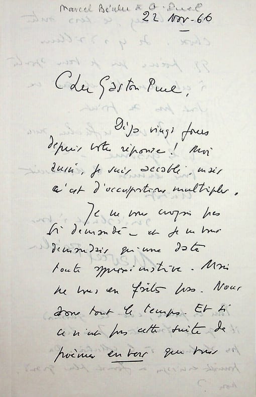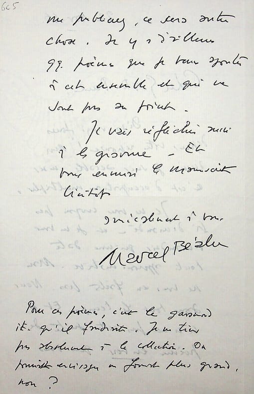 Marcel Béalu (1908-1993), poète, écrivain, libraire de la fameuse librairie disparue « Le Pont traversé », membre de l'école de Rochefort. L.A.S., 22 novembre 1966, 2p in-8. Au poète et éditeur Gaston Puel (1924-2013), autre membre de l'école de Rochefort. « Cher Gaston Puel, Déjà vingt jours depuis votre réponse ! Moi aussi, je suis accablé mais c'est d'occupations multiples. Je ne vous croyais pas si demandé et je ne vous demandais qu'une date tout approximative. Mais en vous en faites pas. Nous avons tout le temps. Et si ce n'est pas cette suite de poèmes en vers que vous me publierez, ce sera autre chose. Il y a d'ailleurs quelques poèmes que je veux ajouter à cet ensemble et qui ne sont pas au point. Je vais réfléchir aussi à la [mot illisible] et vous enverrai le manuscrit bientôt. Amicalement à vous. Marcel Béalu. Pour ces poèmes, c'est le [mot illisible] qu'il faudrait. Je ne tiens pas absolument à la collection. On pourrait envisager un format plus grand, non ? ». Belle lettre sur son projet de publication de La nuit nous garde chez Béalu (il sera publié chez Vodaine). [179]