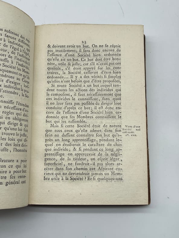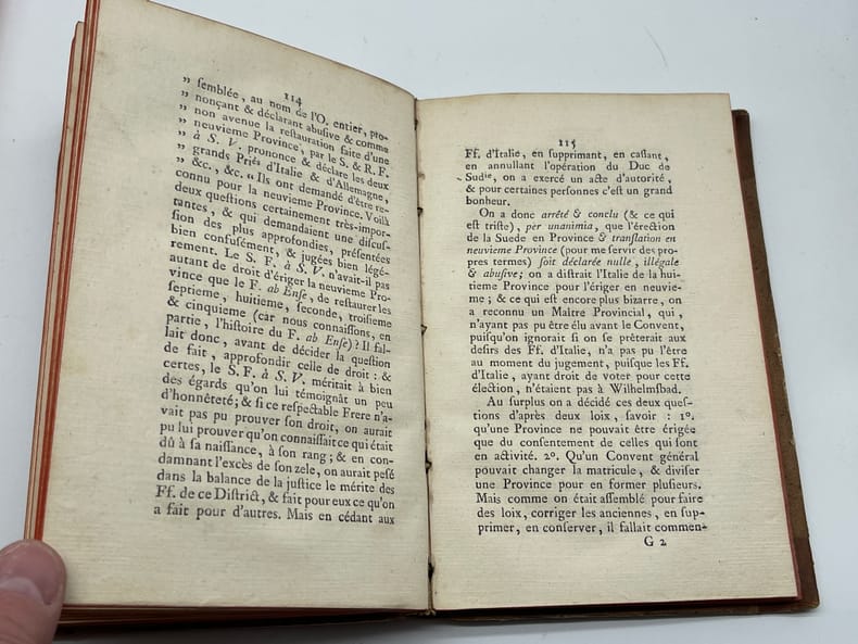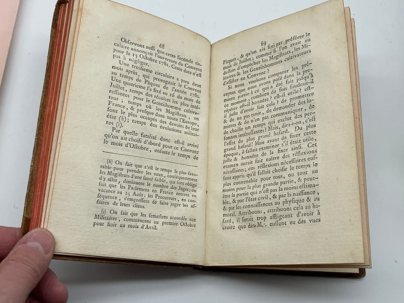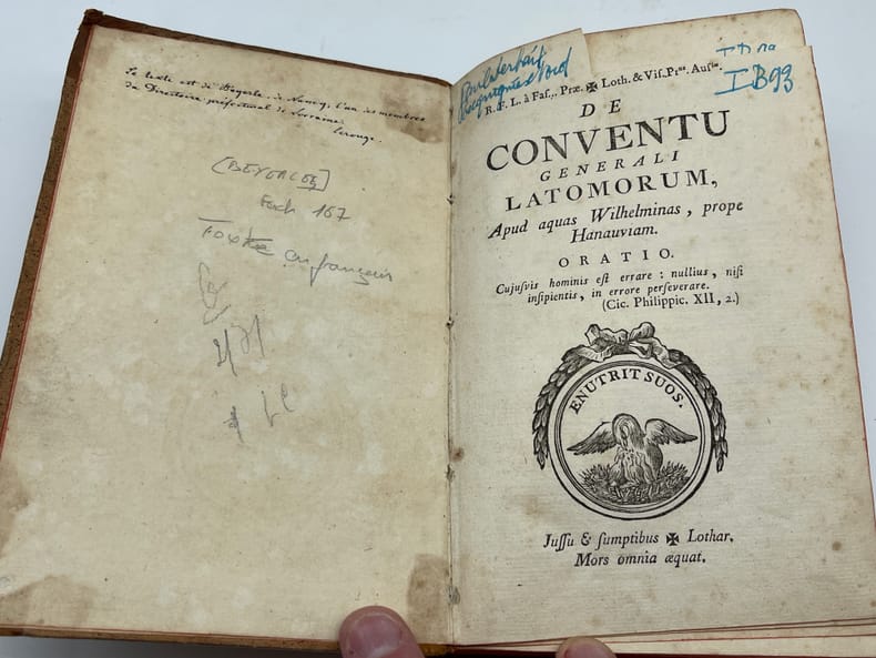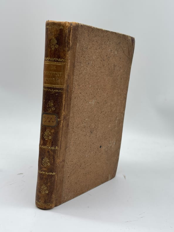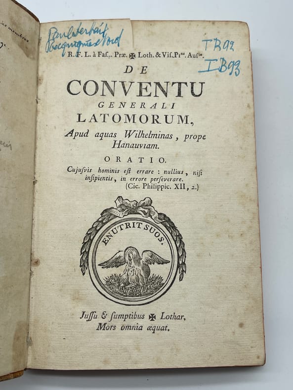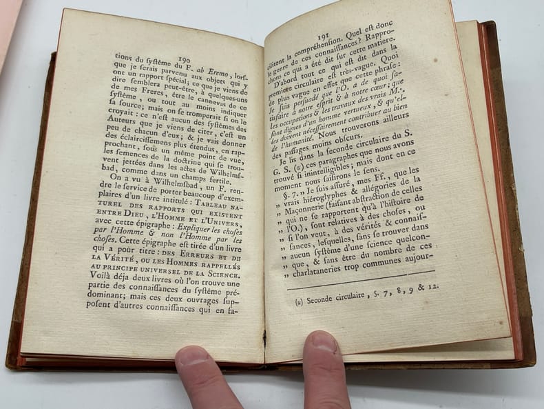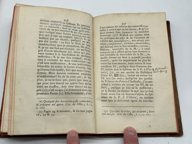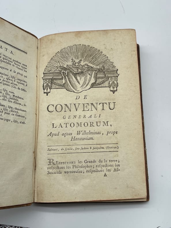 Jean-Pierre-Louis Beyerlé (1738-1799), De Conventu generali latomorum Apud aquad Wilhelminas, prope Hanauviam. Oratio. S.n., s.l., s.d. [Nancy, chez l'auteur, 1782]. In-8, [4]-256p. Edition originale et unique, déjà qualifiée de rare en 1834, de cet ouvrage en français (seul le titre est en latin). Cet ouvrage est un compte-rendu très critique du Convent général des maçons qui eut lieu le 15 juillet 1782 à Wilhelmsbad (auquel Beyerlé n'avait pas participé). Il fut traduit en allemand par Knigge (Illuminati). Notre exemplaire porte plusieurs notes autographes d'André Joseph Etienne Lerouge (1766-1833) et en particulier celle en garde : « Le texte est de Beyerlé, de Nancy, l'un des membres du Directoire préfectoral de Lorraine. Lerouge ». Les deux autres petites notes, p.125 et p.127, sont des références ajoutées (illisibles). 6 exemplaires sont conservés en France : BnF (*2), Nancy, Besançon, Lyon et Le Mans. Aucun exemplaire passé récemment sur le marché. Provenances : André Joseph Etienne Lerouge (1766-1833), vente en 1835, n°34. L'ouvrage est déjà signalé comme rare dans la notice et il est aussi indiqué dans la liste des ouvrages d'une « excessive rareté » ; Paul Serbait (?) De Recquignies (Nord, France), avec son ex-libris manuscrit sur le titre. Demi-basane à coins, dos lisse, pièce de titre. Petite découpé sur la page de titre (en haut à droite). Un mors légèrement affaibli en tête, beau papier légèrement jauni. Coutures légèrement détendues. Très rare ouvrage provenant d'une des plus belles collections maçonniques du XIXe siècle.