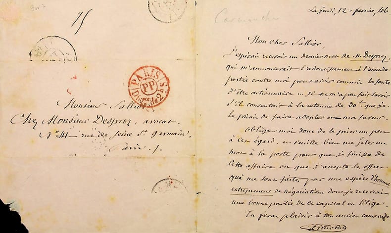 Pierre Carmouche (1797-1868), poète, chansonnier, goguettier, écrivain. L.A.S., 12 février 1846, 1p in-12. Sur papier rose. A Sallior, un avocat ou un avoué. A propos d'une amende qu'il a eu dans un litige. [178b]