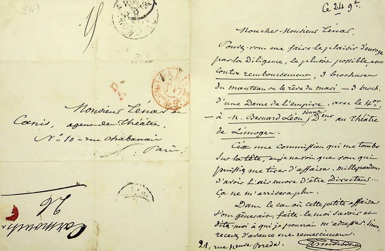 Pierre Carmouche (1797-1868), poète, chansonnier, goguettier, écrivain. L.A.S.,24 septembre [ca.1845], 1p in-12. A un agent de théâtre, M. Lénar (?), afin de lui réclamer plusieurs brochures. [178b]