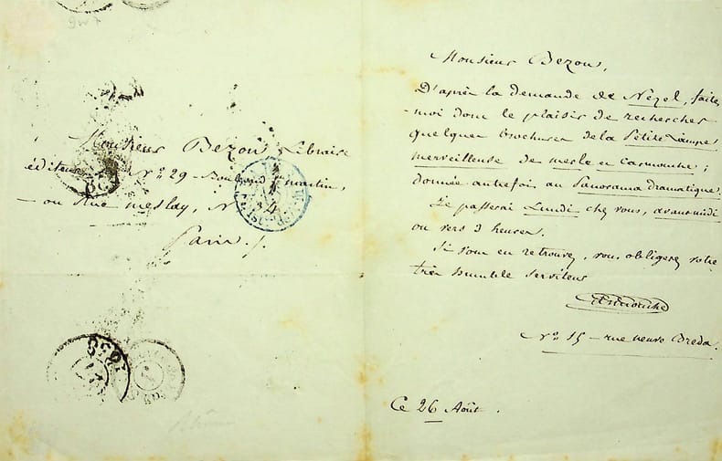 Pierre Carmouche (1797-1868), poète, chansonnier, goguettier, écrivain. L.A.S., 28 août 1858, 1p in-12. Au libraire Victor Bezou (1795-1860) pour lui demander de lui retrouver des exemplaires de son oeuvre La Petite lampe merveilleuse coécrite avec Merle (publiée chez Pollet en 1822). [178b]