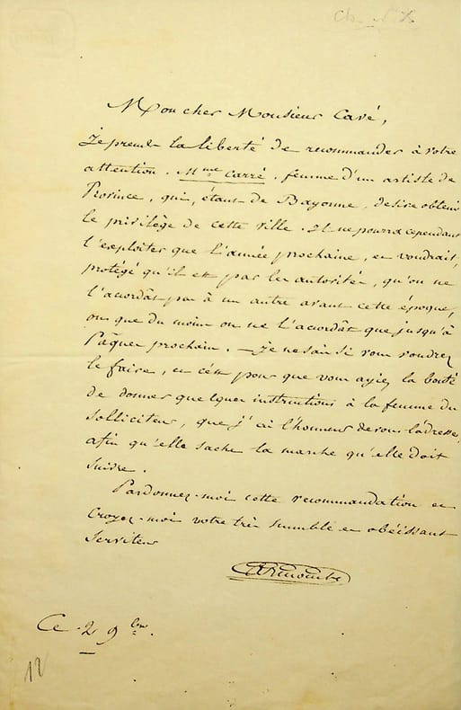 Pierre Carmouche (1797-1868), poète, chansonnier, goguettier, écrivain. L.A.S., 2 novembre, 1p in-8. A l'écrivain Hygin-Auguste Cavé (1796-1852) afin de lui recommander madame Carré, femme d'un artiste de Province, de Bayonne. Jolie lettre. [179b]