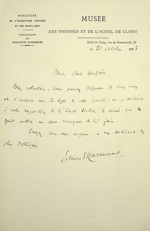 Edmond Haraucourt (1856-1941), poète, écrivain. L.A.S., 29 octobre 1903, 1p in-8. Il accepte que son nom soit inscrit dans la liste du comité de l'exposition de la carte postale. Il s'agit très certainement du « Salon des arts lithographiques et de al carte postale illustrée » en 1904. [179b]
