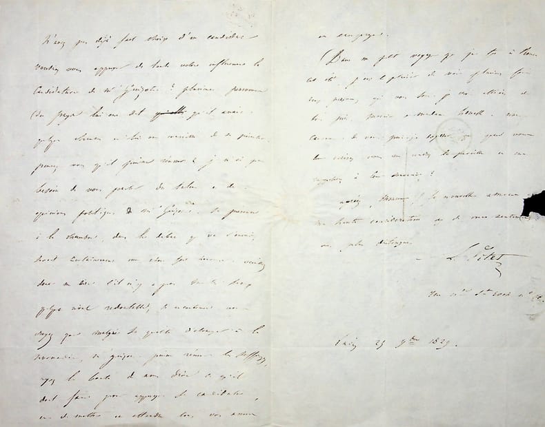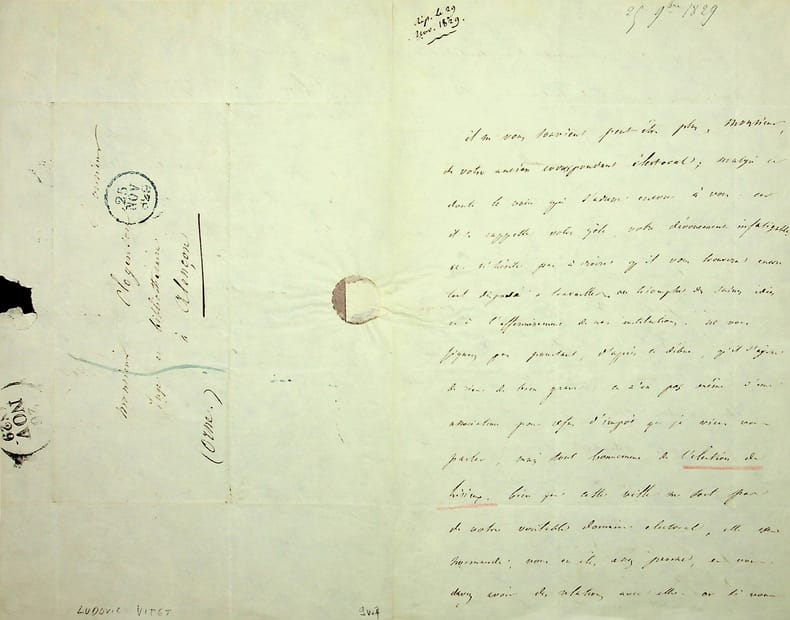 Ludovic Vitet (1802-1873), écrivain, homme politique. L.A.S., 25 septembre 1829, 3p in-8. A Jean Clogenson (1785-1876), homme politique. Il lui parle de « travailler au triomphe des saines idées et à l'affermissement de nos institutions » en l'aidant à soutenir la candidature de François Guizot à Lisieux pour les élections législatives. De fait, il fut élu en janvier 1830 et sera réélu jusqu'à la fin de la monarchie de juillet. Belle lettre. [179b]