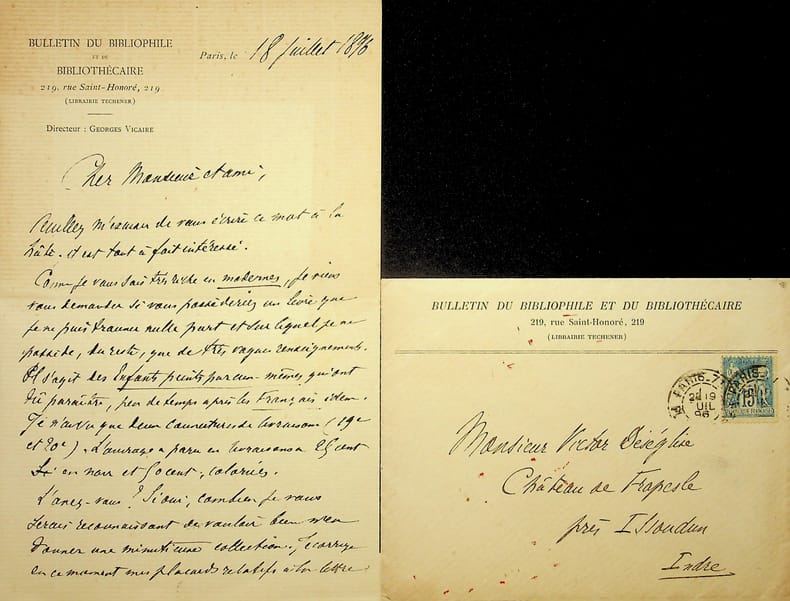 Gabriel Vicaire (1848-1900), poète, écrivain. L.A.S. + enveloppe, 18 juillet 1896, 1p 1/2 in-8. Au bibliophile Victor Deséglise (1839-1916). Il lui demande s'il possède un exemplaire des Enfants peints par eux-mêmes afin de pouvoir corriger son ouvrage. [179b]
