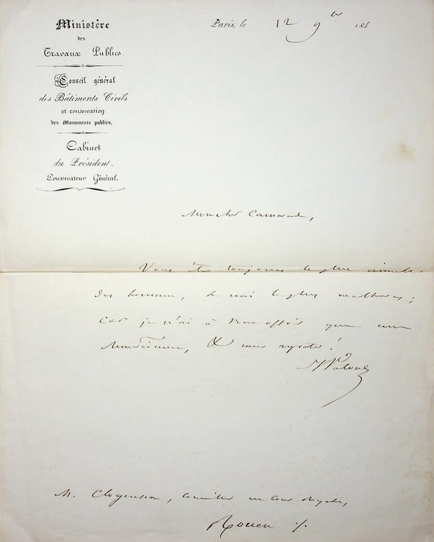Lettre autographe signée à Georges Feydeau, son fils dans laquelle il lui demande de trouver Paul Durand-Ruel qui lui doit de l'argent. Il évoque La Revue internationale de l'art et de la curiosité que ce dernier avait secrètement financé et qu'Ernest Feydeau dirigea. * Membre du SLAM et de la LILA / ILAB Member. La librairie est ouverte du lundi au vendredi de 14h à 19h. Merci de nous prévenir avant de passer,certains de nos livres étant entreposés dans une réserve.