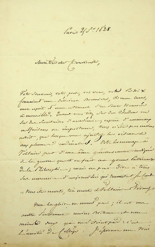 Jean Vatout (1791-1848), écrivain, homme politique, membre de l'Académie française. L.A.S., 25 février 1828, 1p 1/4 in-8. A Jean Clogenson (1785-1876), homme politique. « Votre souvenir, votre prose, vos vers, vos perdrix formaient une délicieuse bourriche, & mon coeur, mon esprit & mon estomac s'en sont trouvés à merveille. Quand vous tirez sur des citadins ou sur des secrétaires d'Académie, espèce d'animaux malfaisans ou importuns, vous n'êtes pas moins adroit, que lorsque vous ajoutez les oiseaux aux plumes cardinales. » Belle lettre. [180]