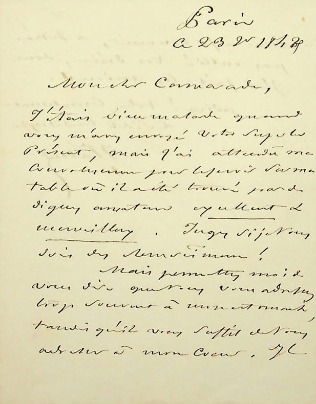 Paris, chez les libraires de la place de la Bourse et ceux du Palais-Royal 1832 XXX, (1ff), 270ppVignettes et culs de lampes gravés sur bois, non signées, d’après Grandville In 8 en demi chagrin bleu marine, dos à cinq nerfs daté en queue 1832, tranche de tête dorée, double exlibris illustré,édition originale illustré d’un dessin représentant une poir mélancolique sur la page de titre, d’après Grandville. Sous le pseudonyme de Louis Benoit Jardinier, se cache Sébastien Peytel, journaliste et notaire à Belley près de Bourg en Bresse. Ce célèbre et rare pamphlet, la physiologie de la poire, ridiculisant le roi en l’assimilant de face et de profil à une poire est une création de Philippon qui est poussée ici à son extrême et achève de ridiculiser le monarque. De Daumier à Granville, tous les caricaturistes reprirent le thème et les murs de Paris se couvrirent de poires en tous genre. Louis Phillipe et les représentants du pouvoir nourrirent depuis une haine féroce à l’encontre ces opposants. En 1838 un fait divers fracassant fit la une des journaux : Peytel était accusé d’avoir assassiné sa femme et son domestique. Apres un procès que d’aucun jugèrent hâtif et malgré la défense de Honoré de Balzac, de Lamartine et de nombreuses personnalités politiques et littéraires. Sébastien Peytel fut reconnu coupable et guillotiné le 28 octobre Place du marché de Bourg en Bresse. Le verdict prononcé provoquât la stupeur générale et l’indignation de nombreuses personnalités de premier plan.Cet exceptionnel exemplaire portant l’Ex-libris de Maurice Garçon est accompagné d’une lettre autographe de Sebastien Peytel, datée du 15 juin 1838.2 ff, à la plume, autographe signée Peytel notaire à Belley La lettre portant le tampon de la ville de Belley est adressé à Monsieur Huvier à Paris. Sebastien Peytel se défend d’être le débiteur d’un certain Monsieur Koeppelin qu’il prétend ne pas connaître. En revanche il demande à son interlocuteur s’il lui serait possible de récupérer l’argent qui lui est du en France et à l’étranger « J’ai différents débiteurs à Paris et en France je crois même que l’un d’eux débiteur de 7 ou 8 mille francs est à l’étranger en Belgique ». Il demande s’il serait possible d’effectuer des recherches pour récupérer ces sommes moyennant une juste rétribution. Cette lettre écrite quelques mois avant l’assassinat de sa femme, est de grande importance : Peytel fut accusé d’avoir tué sa femme afin de capter sa rente et payer ses dettes, mais ont voit bien ici que Sebastien Peytel en s’adressant à cet homme d’affaire disposait d’un capital qu’il tentait de récupérer, quelques mois avant le drame, affaiblissant ainsi le motif d’un hypothétique meurtre. Il est clair que cette lettre aurait été un argument fort en faveur de l’accusé s’il elle avait été produite à l’époque.