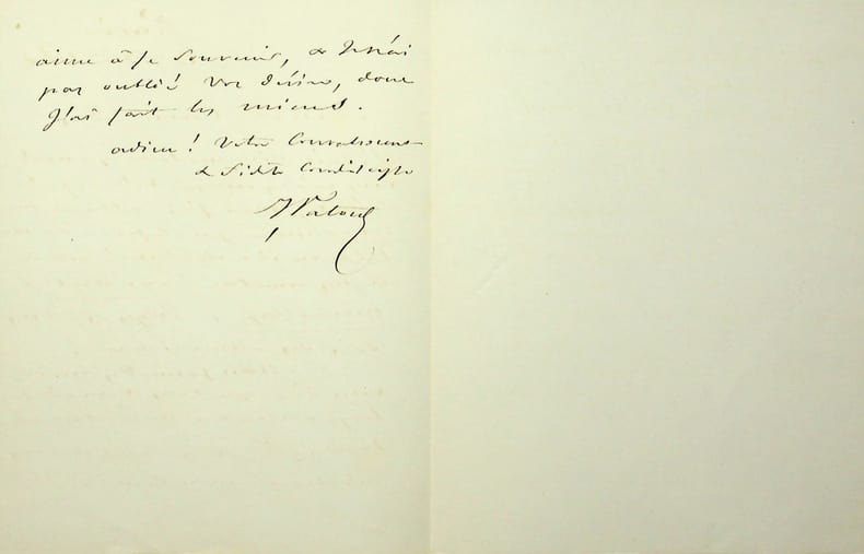 Lettre autographe signée à Georges Feydeau, son fils dans laquelle il lui demande de trouver Paul Durand-Ruel qui lui doit de l'argent. Il évoque La Revue internationale de l'art et de la curiosité que ce dernier avait secrètement financé et qu'Ernest Feydeau dirigea. * Membre du SLAM et de la LILA / ILAB Member. La librairie est ouverte du lundi au vendredi de 14h à 19h. Merci de nous prévenir avant de passer,certains de nos livres étant entreposés dans une réserve.