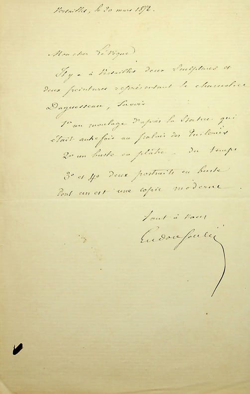 Eudore Soulié (1817-1876), historien de l'art, conservateur de musée. L.A.S., Versailles, 30 mars 1872, 1p in-8. Il donne la liste des sculptures et peintures représentant le chancelier Daguesseau à Versailles. [180]