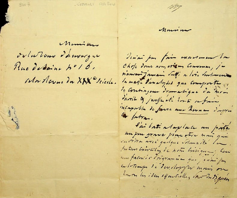 Charles Rabou (1803-1871), écrivain, journaliste. L.A.S., sd [1837?], 1p 1/2 in-8. A M. de la Tour d'Auvergne. Il n'a pu « faire exactement la chose » convenue à cause de la « masse d'analyses que comporte le contingent dramatique du mois d'avril ». Il a donc fait un autre article pour La Revue du XIXe siècle (a priori publiée entre juillet 1836 et septembre 1840). Peu commun. [180]