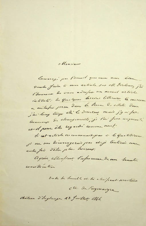 Théodore-Joseph Boudet de Puymaigre (1816-1901), écrivain, originaire de Lorraine. L.A.S., château d'Inglange, 23 juillet 1846, 1p in-8. Au gérant du journal légitimiste La Quotidienne, peut-être Pierre-Sébastien Laurentie (1793-1876). Il lui propose un article, De quelques larcins littéraires, déjà publié dans la Revue de Metz mais largement modifié et qui « peut être regardé comme neuf ». [180]