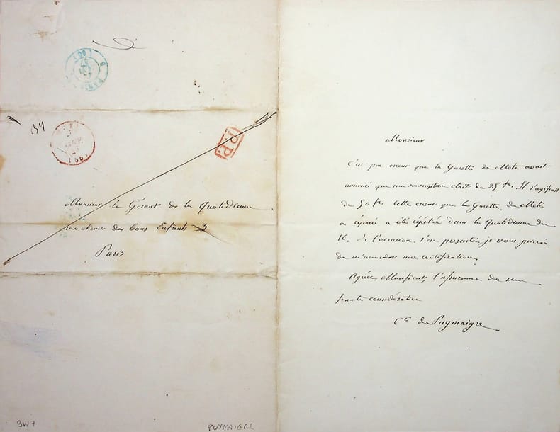 Théodore-Joseph Boudet de Puymaigre (1816-1901), écrivain, originaire de Lorraine. L.A.S., 22 janvier 1847, 1p in-8. Au gérant du journal légitimiste La Quotidienne, peut-être Pierre-Sébastien Laurentie (1793-1876). A propos d'une erreur publiée dans la Gazette de Metz et reprise dans La Quotidienne. [180]
